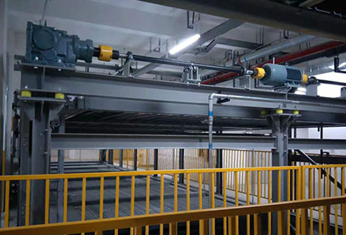 運行原理:車輛入庫時,汽車開入與地面相通的升降機出入平臺,該升降機將汽車升降到車庫停車泊位所在的層,完成入庫;出庫過程與此相反,由所在層的水平橫移驅動機將泊位運送到與地面相通的升降機內,再由升降機將汽車送到地面。